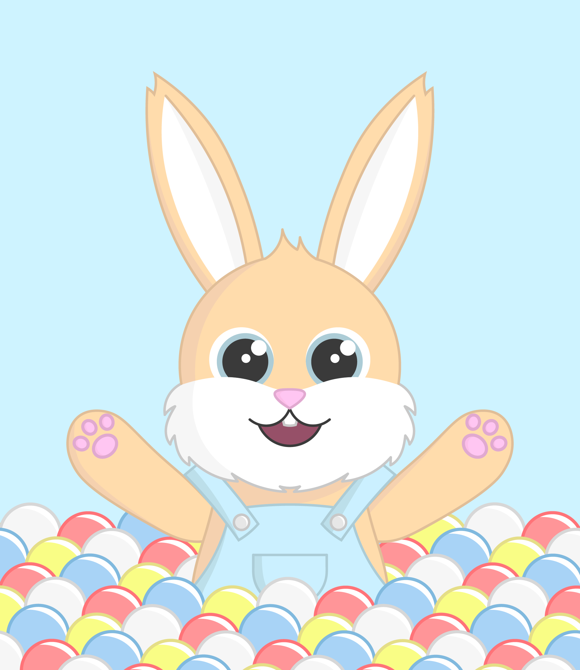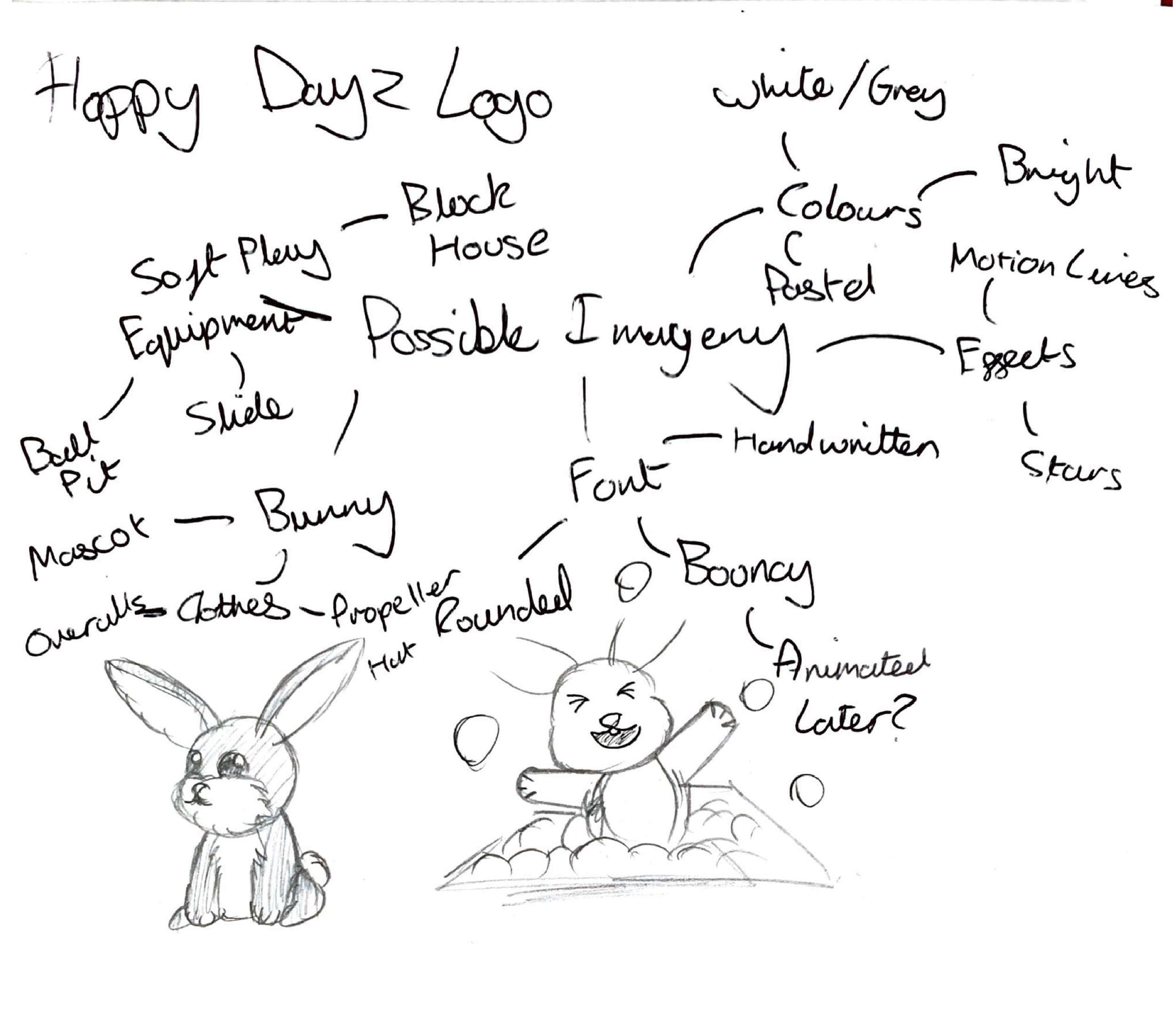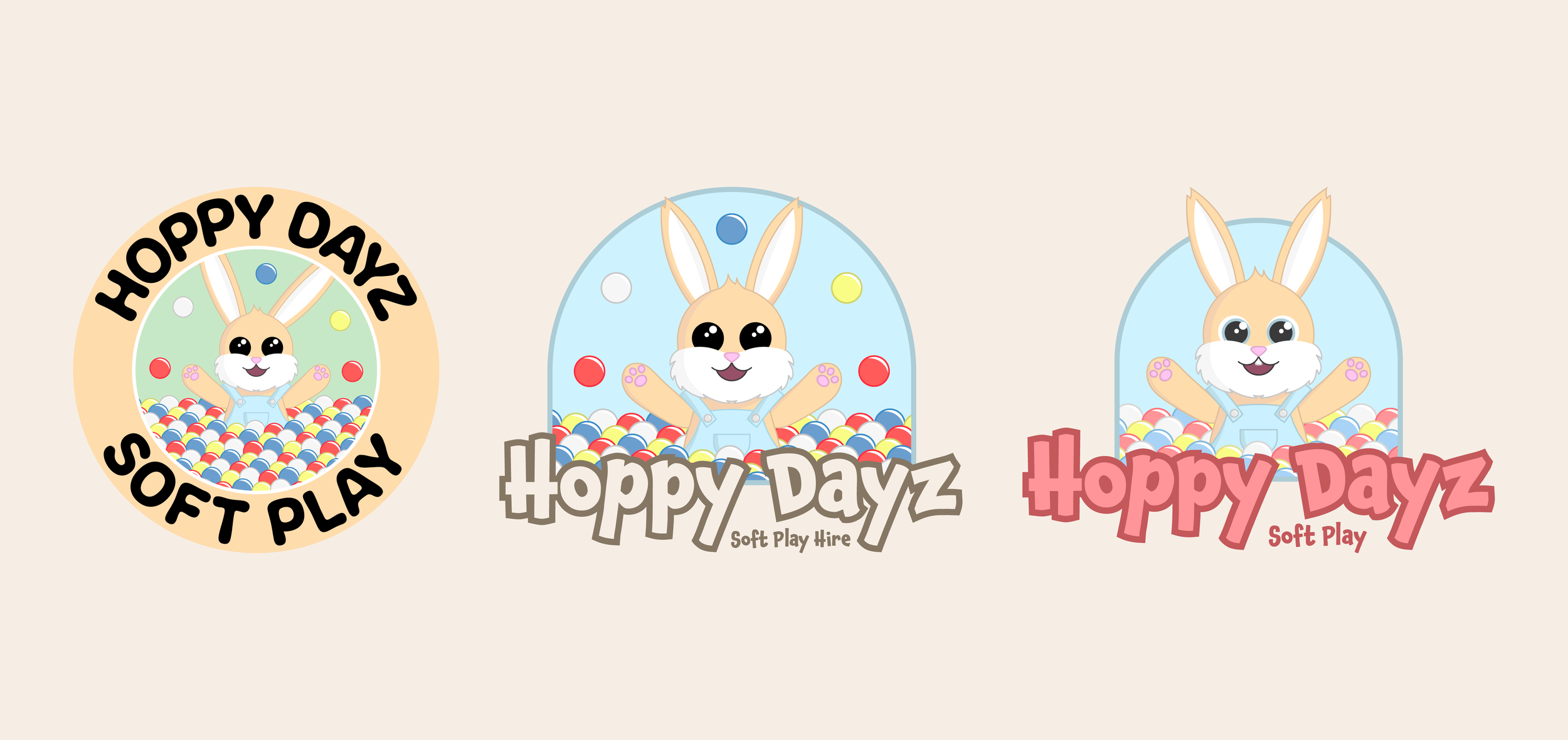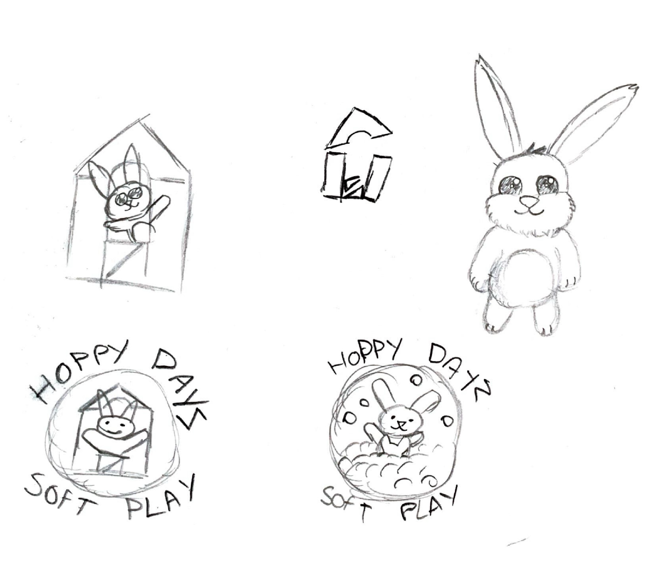 Some draft logo ideas was to have the primary image have the rabbit character interacting with a piece of soft play equipment. I ended up settling for a ball pit with Hoppy sitting in the balls. The design of Hoppy evolved from just being an anthropomorphic rabbit to being a representation of a young child. They were given some dungarees as they are gender neutral for both young boys and girls.