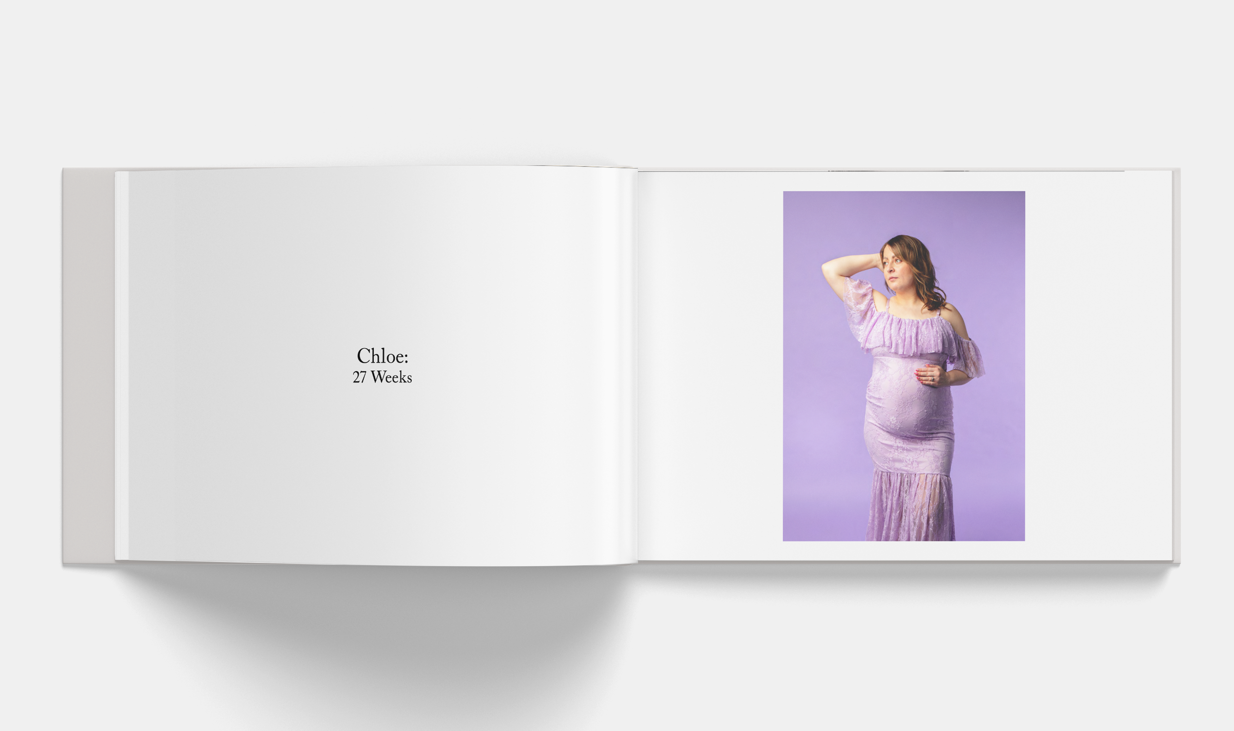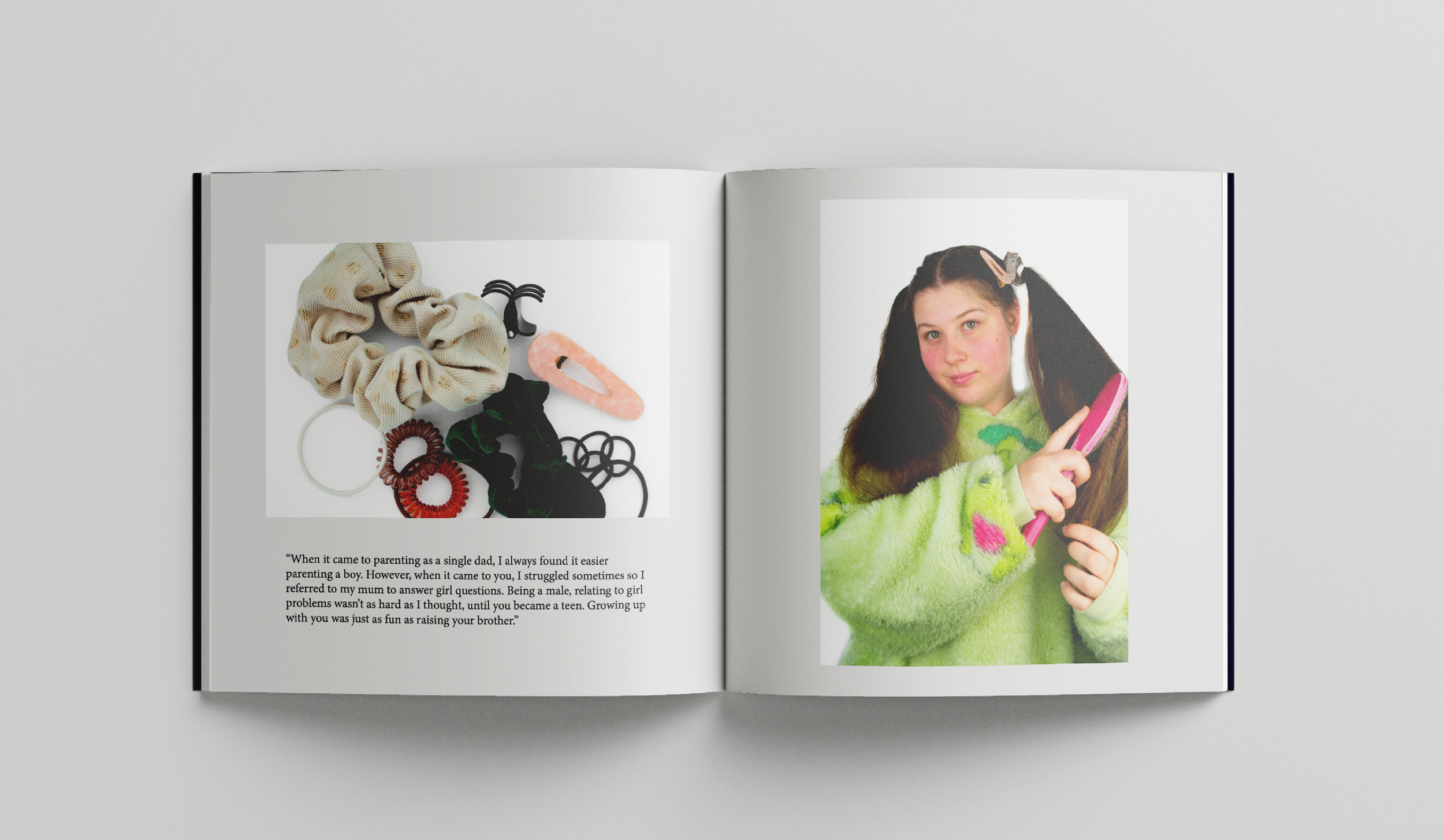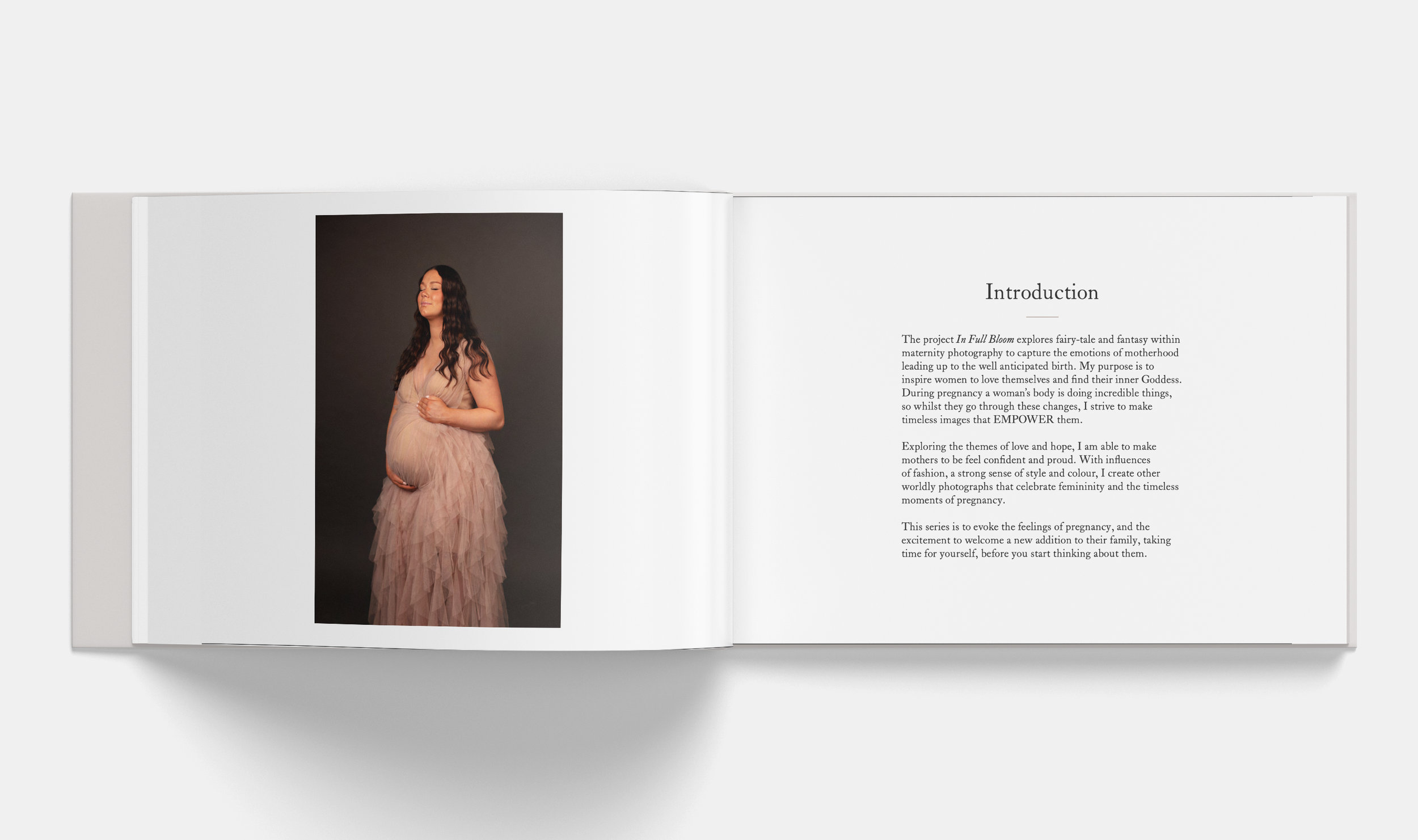 This book is a showcase of some of the maternity clients Amy photographed in her third year. The layout of the book is simple, mainly using its spreads to showcase the photographs with accompanying captions. This book was printed and displayed at Birmingham City University’s 2024 graduate showcase, Infinity.